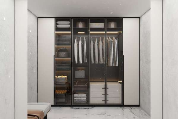 Textilfreundliche Belüftung: Um die Form Ihrer Kleidung und Schuhe zu erhalten und Feuchtigkeit sowie Gerüche zu vermeiden, integrieren wir verdeckte Belüftungskanäle innerhalb des Schranks und wählen atmungsaktive, natürliche Materialien aus.